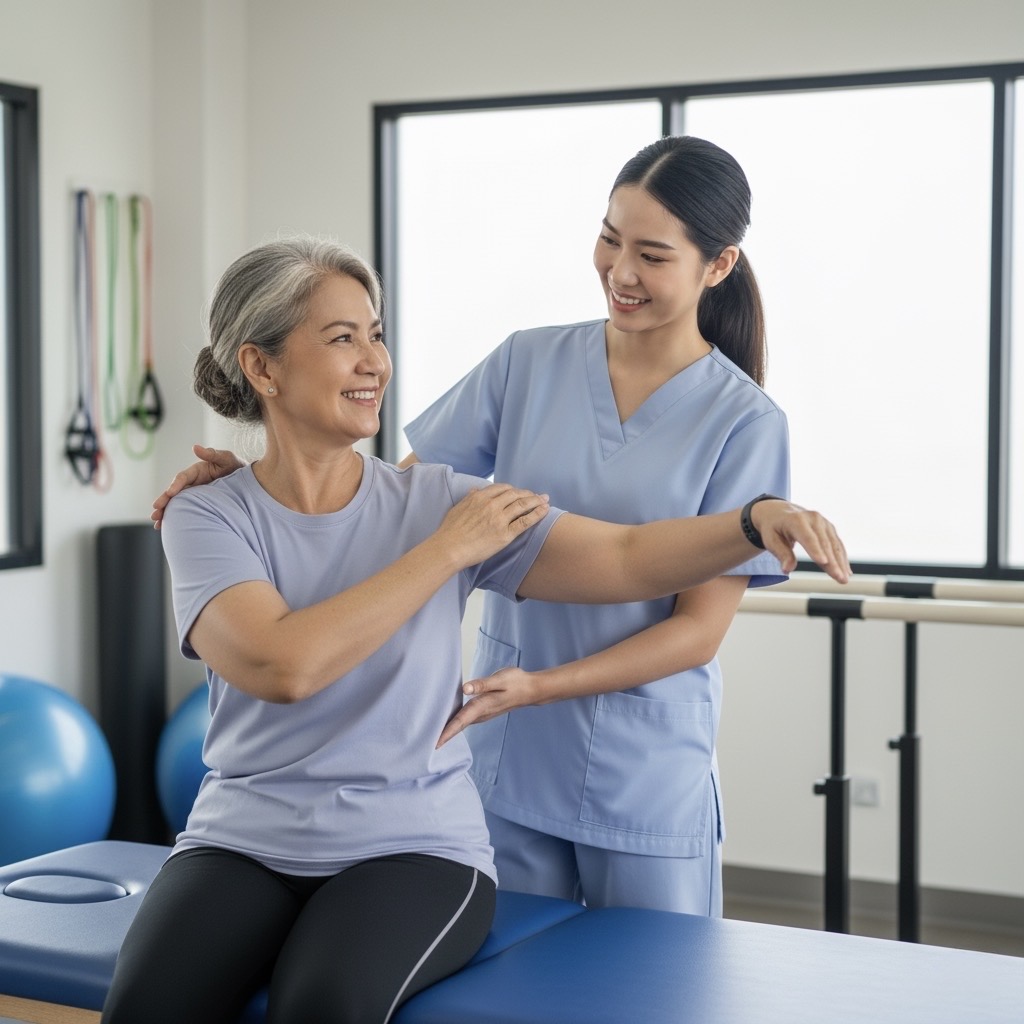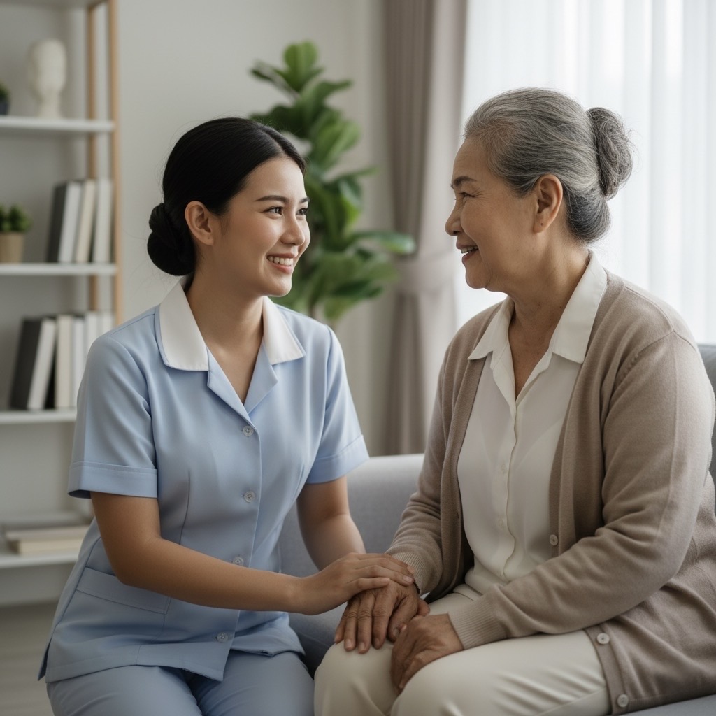 ภาพพยาบาลกำลังดูแลผู้สูงอายุภายในบ้าน เช่น การช่วยพยุง การพูดคุย หรือการดูแลกิจวัตรประจำวัน แสดงถึงการดูแลที่ใส่ใจและเหมาะสมกับสภาพร่างกายของผู้สูงอายุ บริการเยี่ยมผู้ป่วยและผู้สูงอายุถึงบ้านโดย พยาบาลวิชาชีพ (Registered Nurse) เพื่อให้การดูแลทั้งระยะสั้น ระยะยาว หรือเป็นครั้งคราว ตามความเหมาะสมของผู้ป่วยแต่ละราย พยาบาลของเราพร้อมให้การดูแลอย่างใกล้ชิดทั้งในด้านร่างกายและจิตใจ รวมถึงสามารถ พาผู้ป่วยไปโรงพยาบาลเพื่อพบแพทย์ เมื่อจำเป็นได้อย่างปลอดภัย